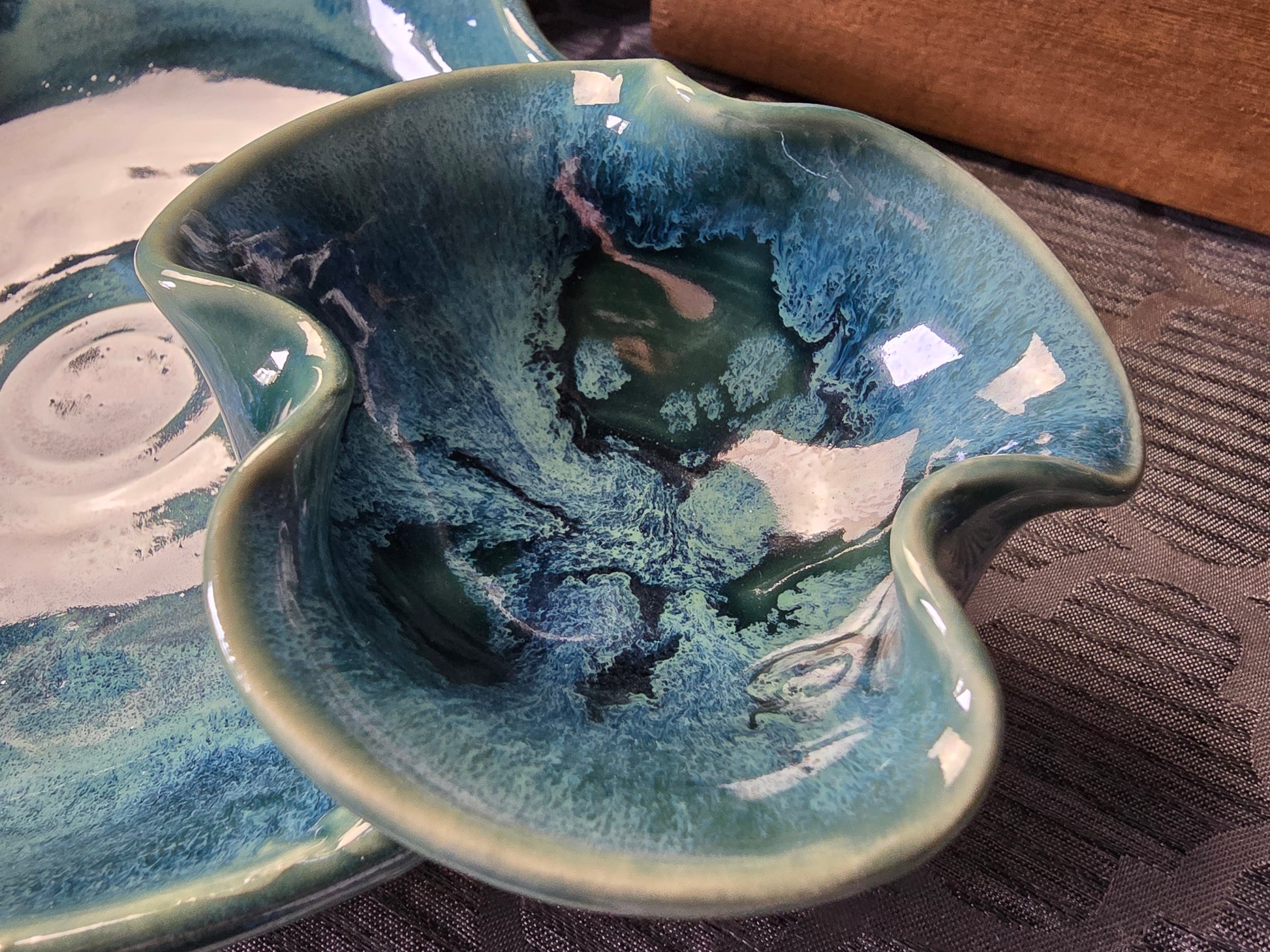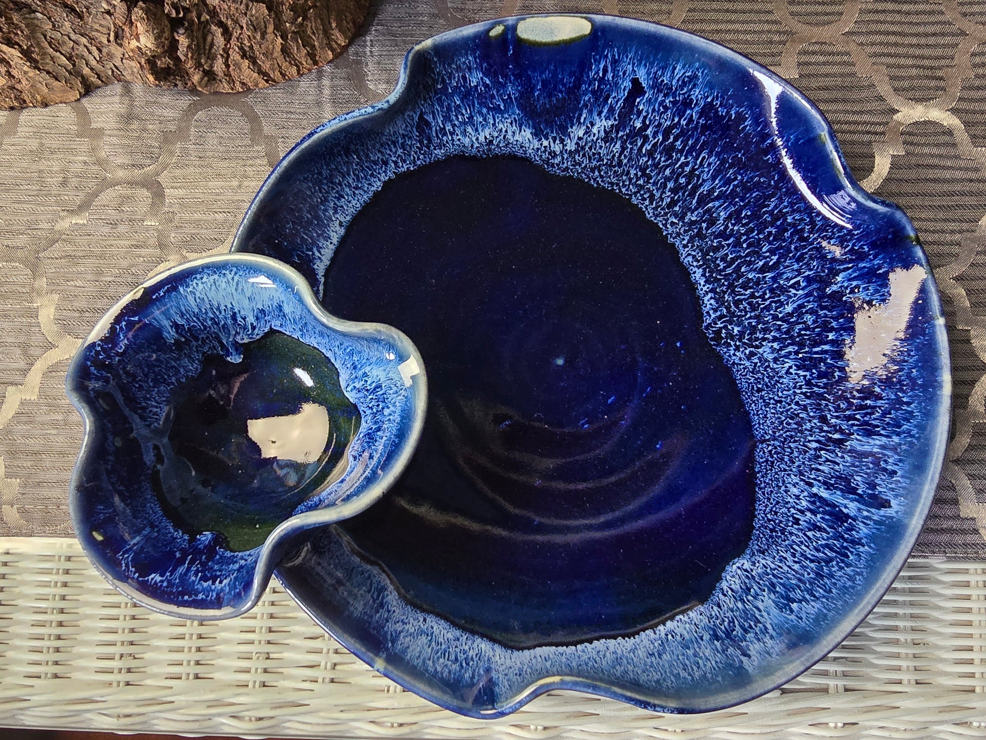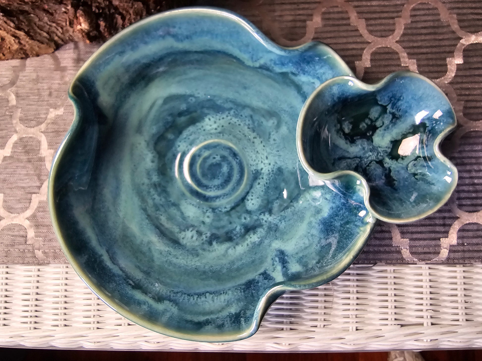 This platter is wheel thrown and reshaped to nestle the dip bowl beside the plate.