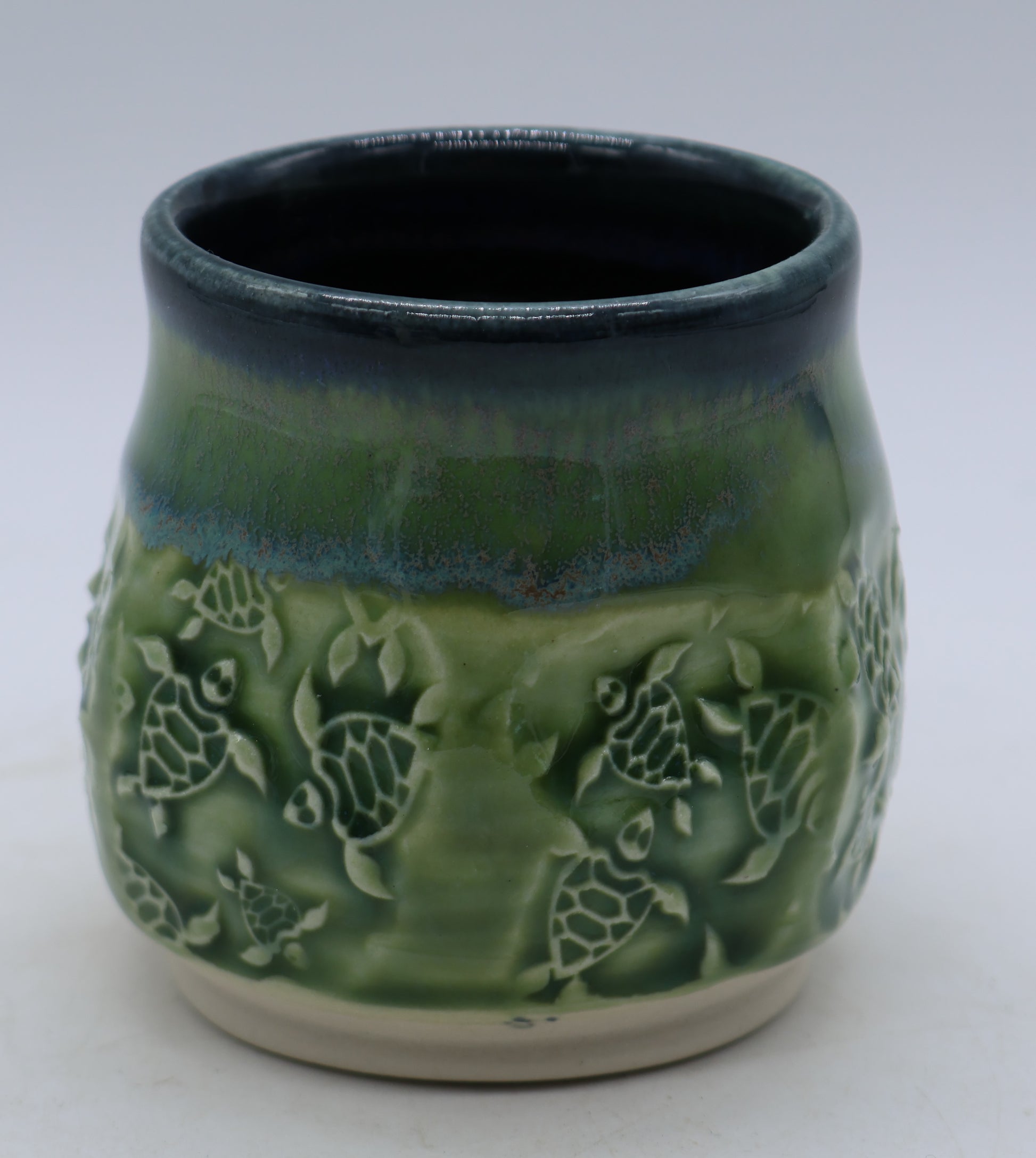 These sweet little sea turtle whiskey cups are handmade. Wheel thrown with high fire porcelain and after completed, trimmed and texture print added its fired once then again after a special layering of glazes to create a mix of greens resembling sea turtles colors.